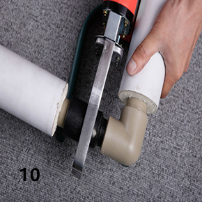 (三)將切出PPR管頭與PPR配件內孔熔接線對比,用筆在管頭處標繪出合適的熱熔深度。連接時,無旋轉的把管頭插入加熱模頭內,插入到所標志的深度,同時無旋轉的把配件推到加熱管上,達到標繪處。一般可用心中默數數字法掌握加熱時間,或觀察管件、管材的加熱程度,當模頭上出現一圈PPR熱熔凸緣時,即可將管材、管件從模頭上取下,迅速轉地直線均勻插入到所標深度,使接頭處形成凸緣。